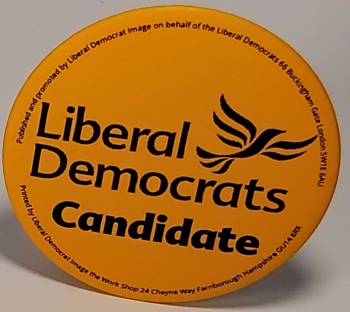 Round 55mm yellow tin pin badge with the Party logo and name in black.